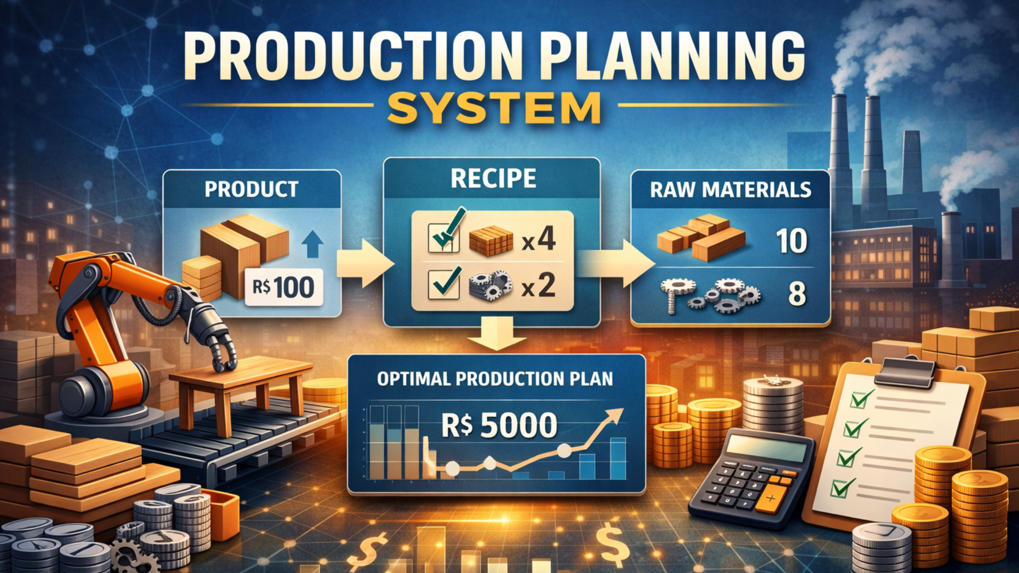 Neste projeto desenvolvi uma API REST de planejamento de produção utilizando Java 21, Spring Boot, Spring Data JPA e MySQL. A aplicação simula um cenário industrial onde é necessário gerenciar produtos, matérias-primas e receitas de produção. Com base no estoque disponível, o sistema calcula quais produtos podem ser fabricados e em qual quantidade.